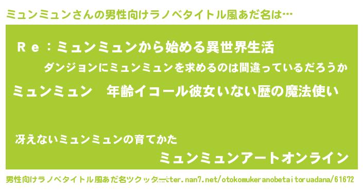 | 女子向けラノベタイトル風あだ名 | 『ミュンミュンの玉の輿計画!』 |