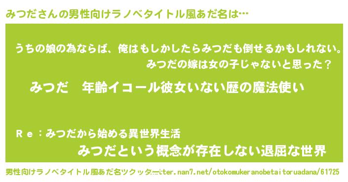 | 女子向けラノベタイトル風あだ名 | 『みつだの玉の輿計画!』『闇のみつだ』 |