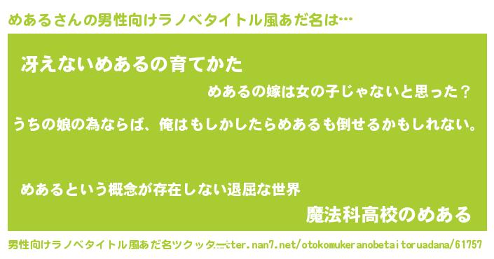 | 女子向けラノベタイトル風あだ名 | 『めあるの婚約者』『めあるアンティーク』 |