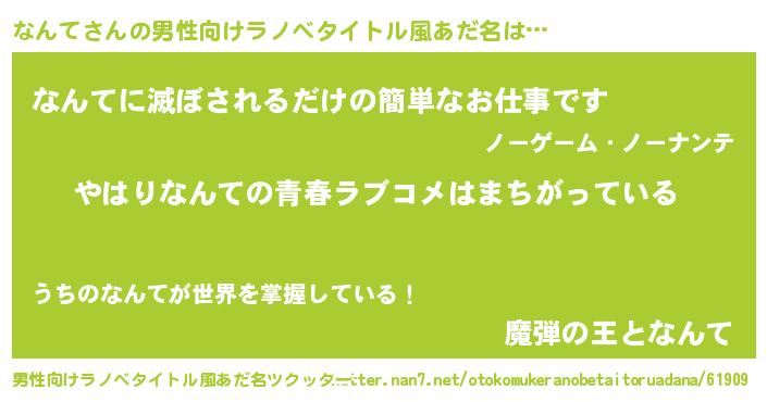 | 女子向けラノベタイトル風あだ名 | 『なんて伯爵の花嫁』『死神なんての再婚』 |