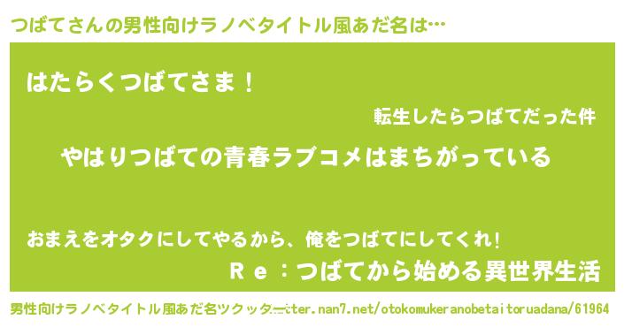 つばてさんの男性向けラノベタイトル風あだ名をツクッター!