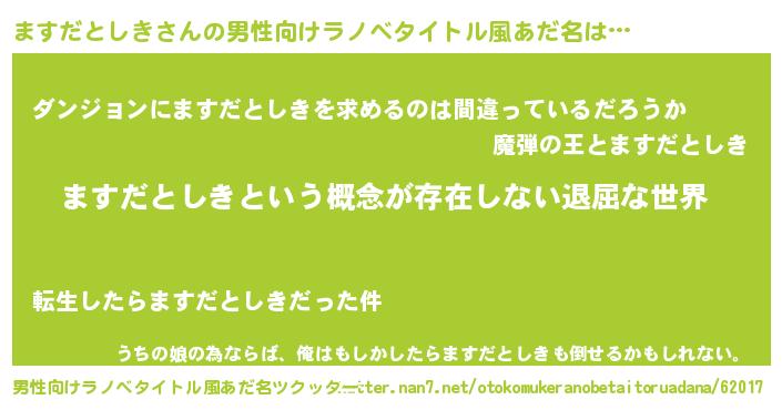 | 女子向けラノベタイトル風あだ名 | 『異世界で失敗しない100のますだとしき』 |