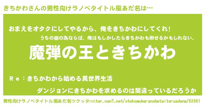 | 女子向けラノベタイトル風あだ名 | 『乙女ゲームの破滅フラグしかない悪役きちかわに転生してしまった…』 |