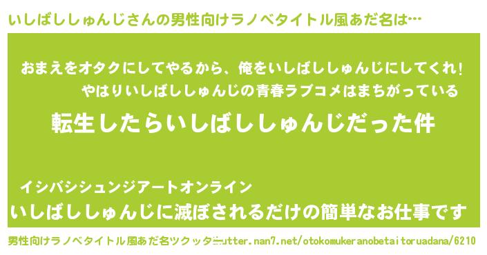 | 女子向けラノベタイトル風あだ名 | 『いしばししゅんじの玉の輿計画!』 |