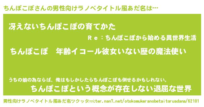 | 女子向けラノベタイトル風あだ名 | 『ちんぽこぽの玉の輿計画!』 |