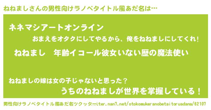 | 女子向けラノベタイトル風あだ名 | 『ねねましの玉の輿計画!』 |