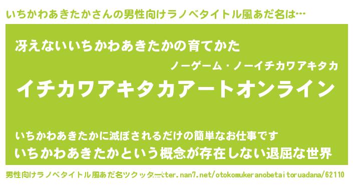 | 女子向けラノベタイトル風あだ名 | 『誰かこのいちかわあきたかを説明してください! ~契約から始まるウェディング~』 |