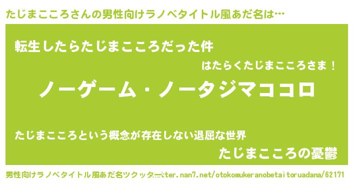 | 女子向けラノベタイトル風あだ名 | 『死神たじまこころの再婚』 |