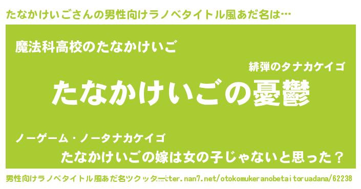 | 女子向けラノベタイトル風あだ名 | 『(仮)たなかけいごのやんごとなき事情』 |