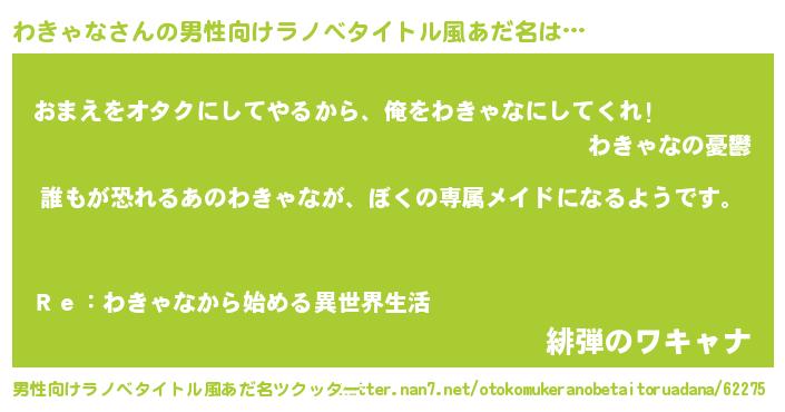 | 女子向けラノベタイトル風あだ名 | 『わきゃなの契約王妃』 |