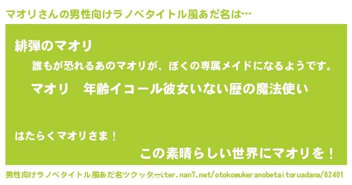 | 女子向けラノベタイトル風あだ名 | 『マオリの玉の輿計画!』 |