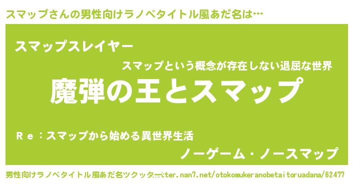 | 女子向けラノベタイトル風あだ名 | 『乙女ゲームの破滅フラグしかない悪役スマップに転生してしまった…』 |