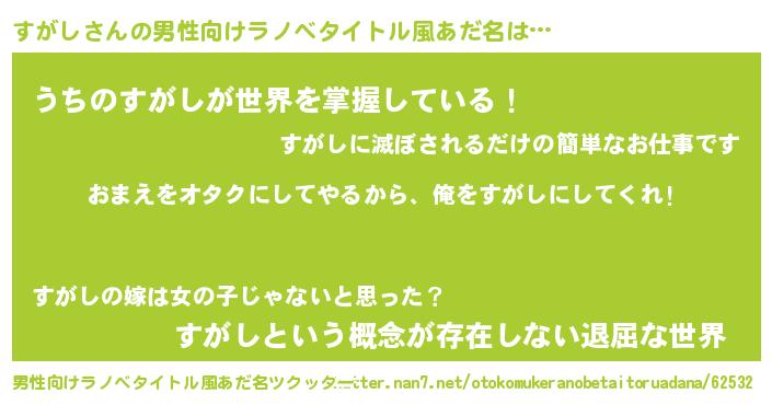 | 女子向けラノベタイトル風あだ名 | 『すがし夫妻のなれそめ』 |