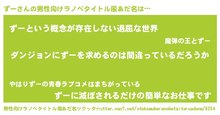 | 女子向けラノベタイトル風あだ名 | 『ずーは平凡を望む』『ずーの雑貨屋さん』 |