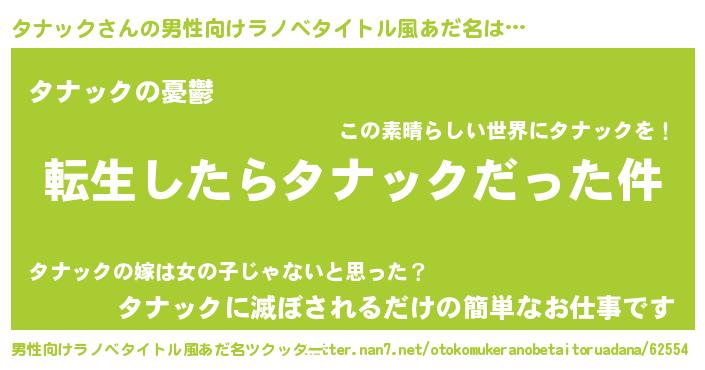 | 女子向けラノベタイトル風あだ名 | 『タナックの玉の輿計画!』 |