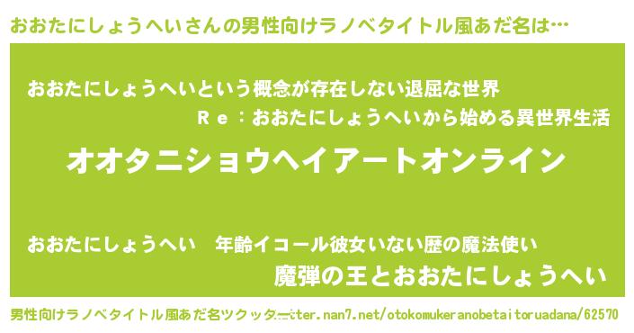 | 胡散臭い通販商品みたいなあだ名 | 『億万長者になれるブレスレット…その名も「おおたにしょうへい」』 |