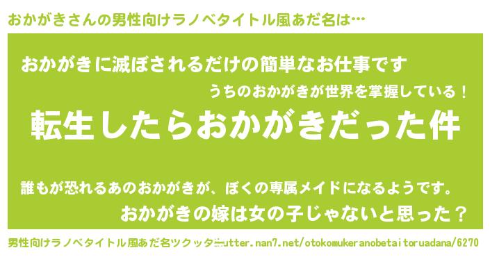 | 女子向けラノベタイトル風あだ名 | 『おかがきの玉の輿計画!』 |