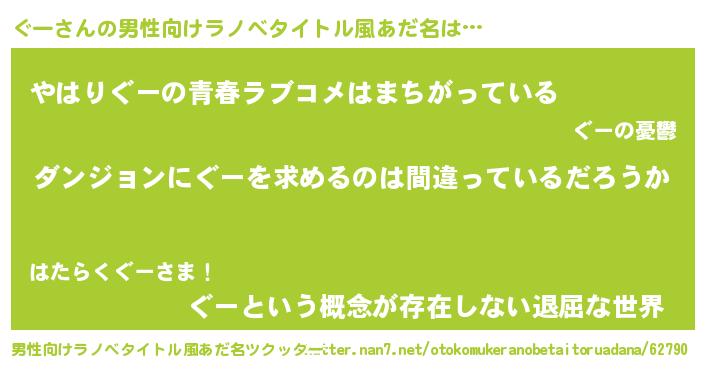 | 女子向けラノベタイトル風あだ名 | 『ぐーは平凡を望む』『ぐーの雑貨屋さん』 |