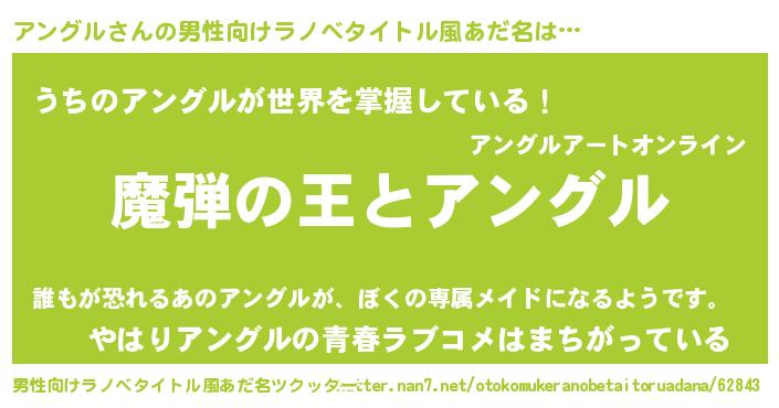 | 女子向けラノベタイトル風あだ名 | 『アングルが死なない童話 林檎のアングルの診療簿』 |