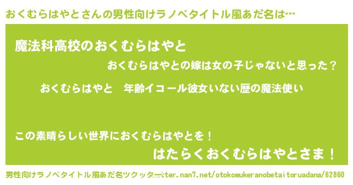 | 女子向けラノベタイトル風あだ名 | 『おくむらはやとの玉の輿計画!』 |