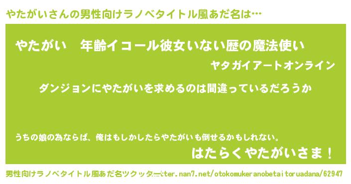 | 女子向けラノベタイトル風あだ名 | 『やたがいの卵を拾いまして』 |