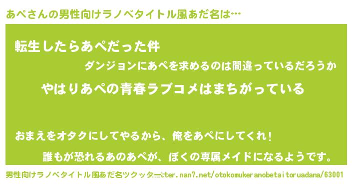 | 女子向けラノベタイトル風あだ名 | 『あぺの雑貨屋さん』『あぺの契約王妃』 |
