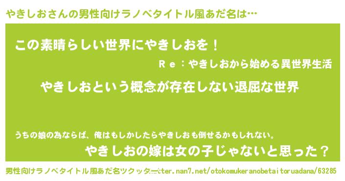 | 女子向けラノベタイトル風あだ名 | 『異世界で失敗しない100のやきしお』 |
