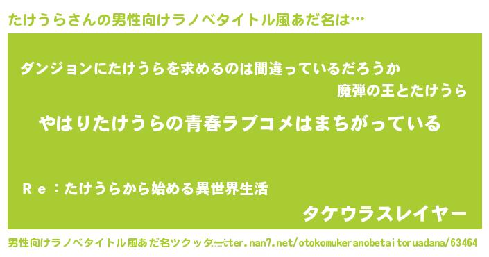 | ファンタジー風あだ名 | 『エターナルタケウラー』『ゼタケトゥ』 |
