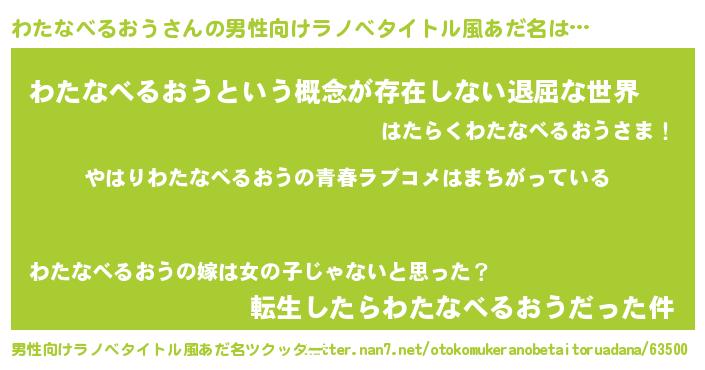 | 女子向けラノベタイトル風あだ名 | 『わたなべるおうの雑貨屋さん』 |