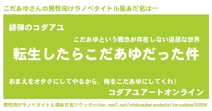 | 女子向けラノベタイトル風あだ名 | 『婚約破棄系悪役こだあゆに転生したので、保身に走りました。』 |
