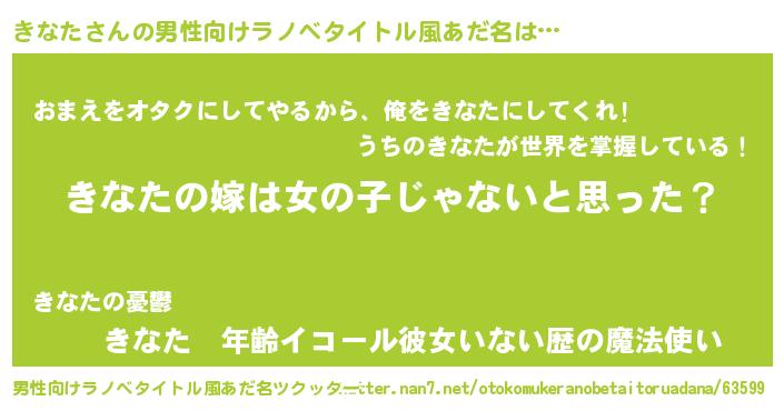 | 女子向けラノベタイトル風あだ名 | 『きなたの卵を拾いまして』 |