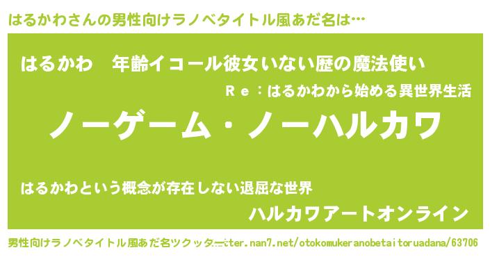 | 女子向けラノベタイトル風あだ名 | 『死神はるかわの再婚』 |
