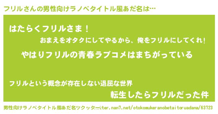 | 女子向けラノベタイトル風あだ名 | 『フリルの雑貨屋さん』 |