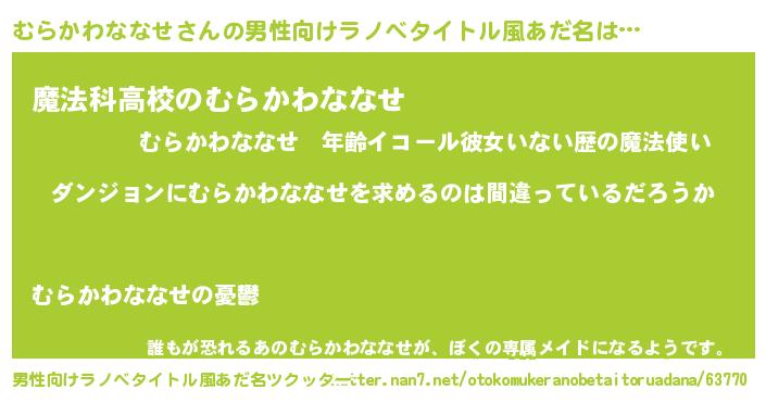| 女子向けラノベタイトル風あだ名 | 『むらかわななせの卵を拾いまして』 |