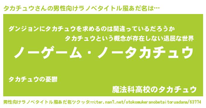 | 女子向けラノベタイトル風あだ名 | 『死神タカチュウの再婚』 |