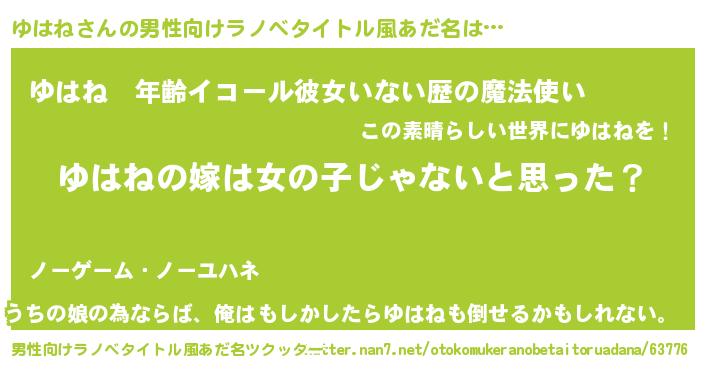| 女子向けラノベタイトル風あだ名 | 『ゆはねの卵を拾いまして』 |