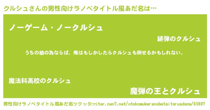 | 女子向けラノベタイトル風あだ名 | 『クルシュ伯爵の花嫁』『クルシュ恋絵巻』 |
