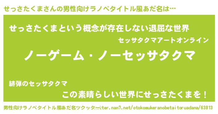 | 女子向けラノベタイトル風あだ名 | 『死神せっさたくまの再婚』 |