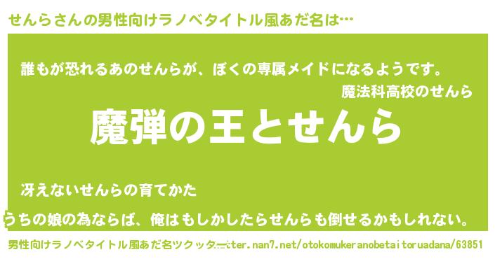 | 女子向けラノベタイトル風あだ名 | 『乙女ゲームの破滅フラグしかない悪役せんらに転生してしまった…』 |
