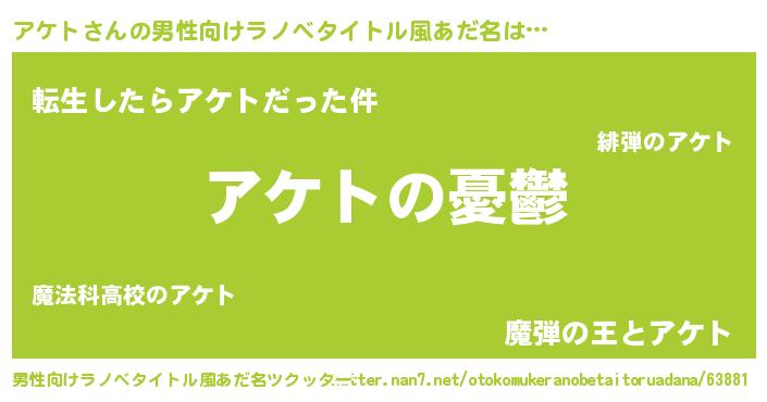 | 女子向けラノベタイトル風あだ名 | 『(仮)アケトのやんごとなき事情』 |