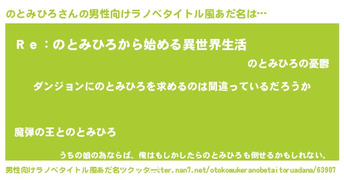 | 女子向けラノベタイトル風あだ名 | 『のとみひろの卵を拾いまして』 |