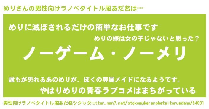 | 女子向けラノベタイトル風あだ名 | 『死神めりの再婚』『横柄めりと宰相陛下』 |