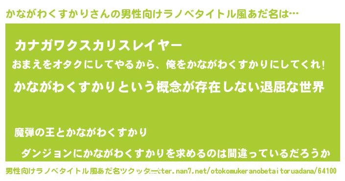| 女子向けラノベタイトル風あだ名 | 『異世界で失敗しない100のかながわくすかり』 |