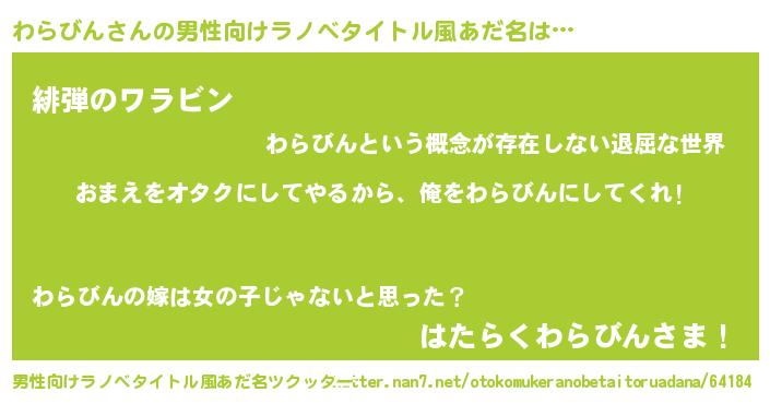 | 女子向けラノベタイトル風あだ名 | 『わらびん夫妻のなれそめ』 |