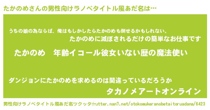 | 女子向けラノベタイトル風あだ名 | 『たかのめの玉の輿計画!』 |