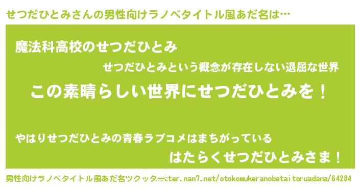 | 女子向けラノベタイトル風あだ名 | 『乙女ゲームの破滅フラグしかない悪役せつだひとみに転生してしまった…』 |