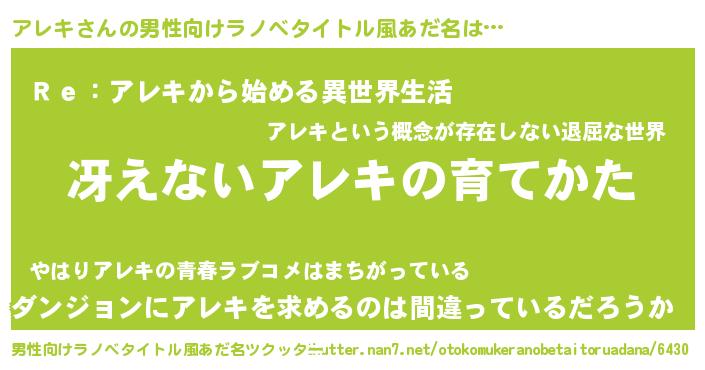 | 意味不明あだ名 | 『自称アレキ』『とにかく怪しいアレキ』 |