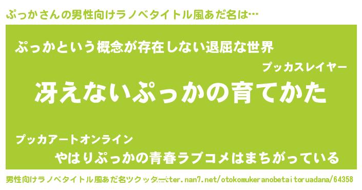 | 胡散臭い通販商品みたいなあだ名 | 『来世でも幸せになれる水素水…その名も「ぷっか」』 |