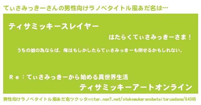 | 女子向けラノベタイトル風あだ名 | 『てぃさみっきー伯爵の花嫁』 |
