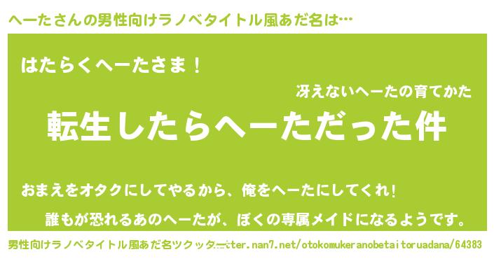 | 女子向けラノベタイトル風あだ名 | 『へーたの玉の輿計画!』 |
